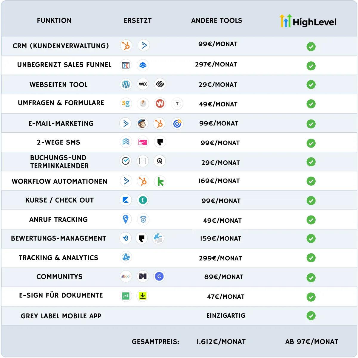 HighLevel bietet CRM, Newsletter, E-Mail-Marketing, Landingpages, Terminbuchung, SMS, Mitgliederbereiche, Communitys, Automatisierungen und vieles mehr in einem Tool.